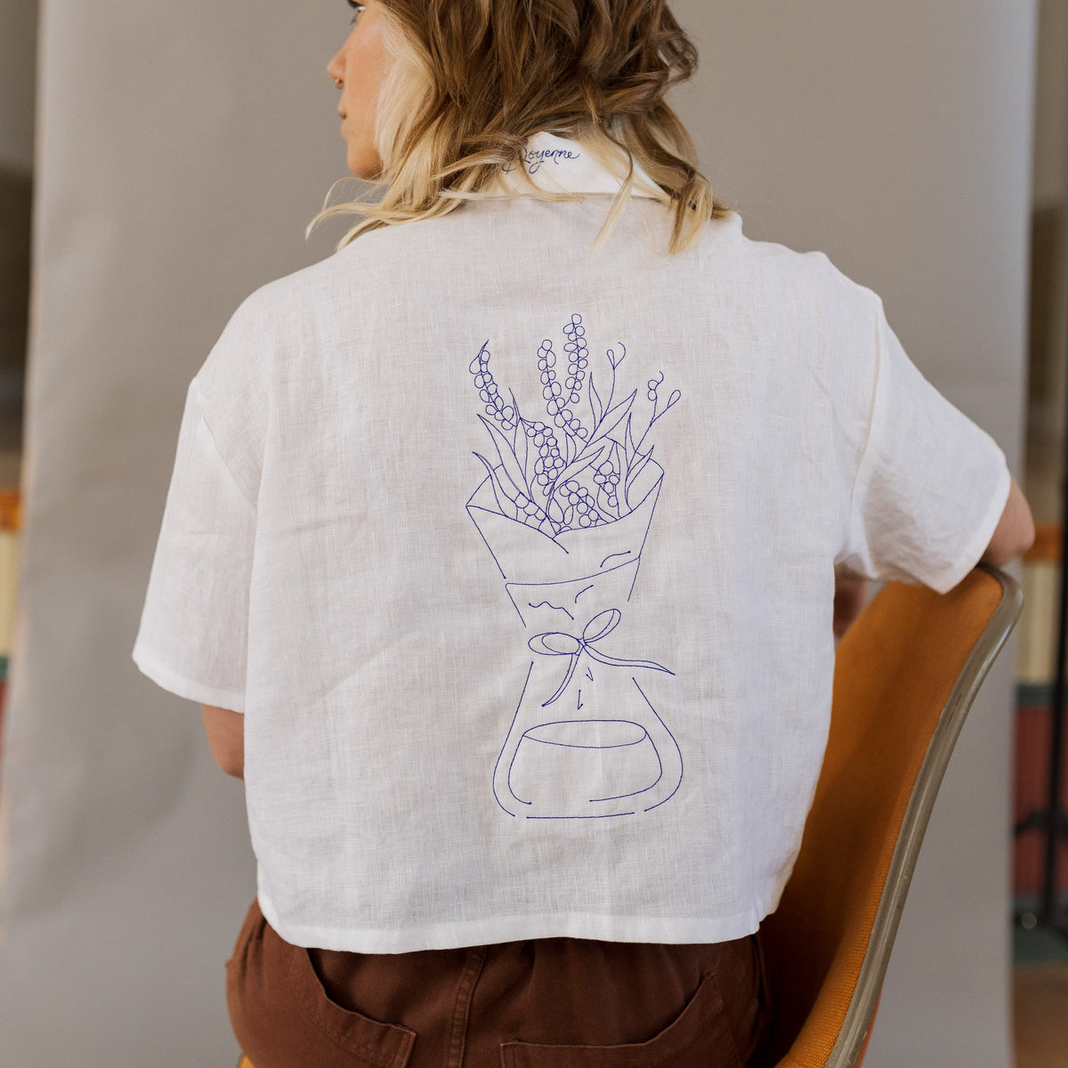 Presenting the Doyenne Embroidered Linen top. Doyenne is a curated monthly subscription program featuring female coffee producers of exceptional prowess within the industry. We’ve created this embroidered linen top piece in collaboration with the collection, embroidered with a Chemex design on the back holding a bouquet of blossoming coffee branches. This lightweight linen pairs effortlessly with a very special cup of coffee produced by outstanding women, who are adding remarkable and distinct value to the industry.