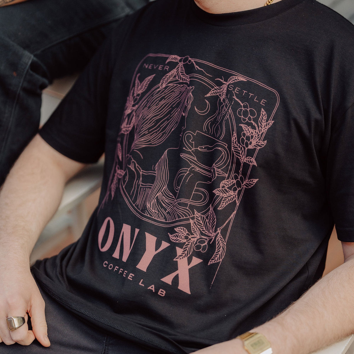 Historic Art Nouveau combines effortlessly with our classic style and motifs in this relaxed-fit heavyweight short sleeve. Complex organic and natural details including fruitful coffee branches adorn an ornate frame, illustrated seamlessly next to our name in large type below. This ornate design takes an artistic spin on traditional coffee-themed graphic tees, and is offered in neutral hues Black and Rose.